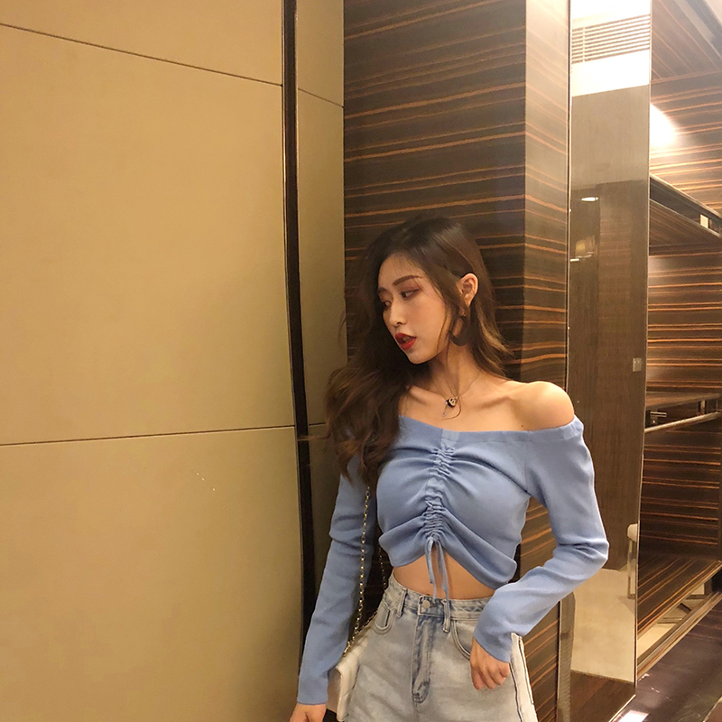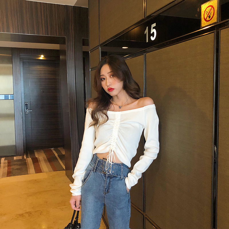 復古韓國chic風氣質時尚純色百搭長袖抽繩系帶一字肩上衣針織衫女