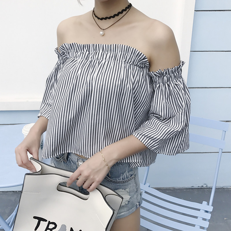 早春新款女裝韓版復古條紋一字領露肩寬松顯瘦學生短袖襯衫上衣女