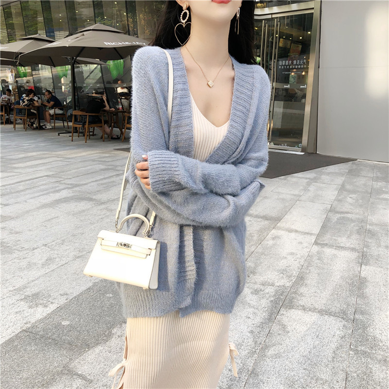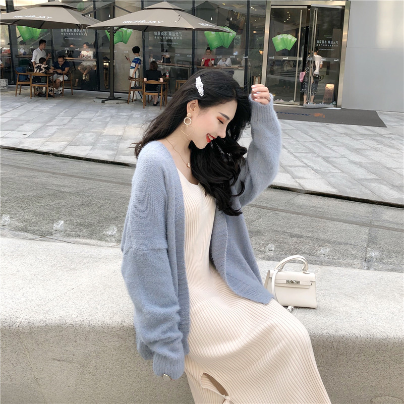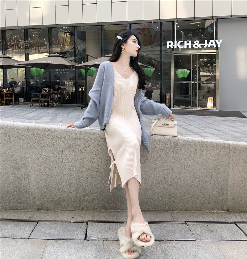 2018秋季新款百搭寬松開衫中長款外套女V領針織打底裙時尚套裝潮