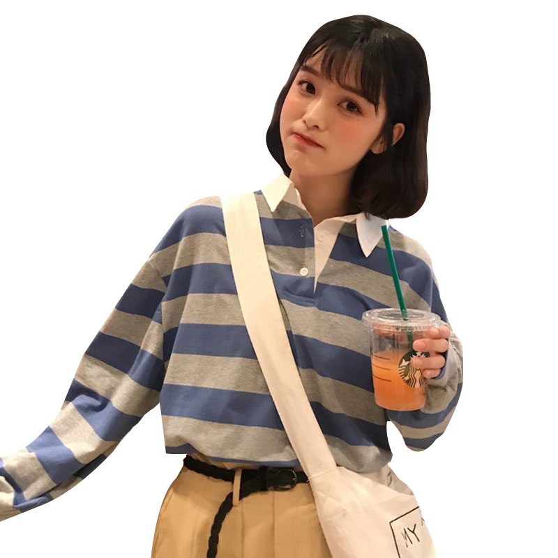 / 秋季女裝韓版復古學院風撞色條紋polo領襯衣寬松長袖休閑襯衫上衣