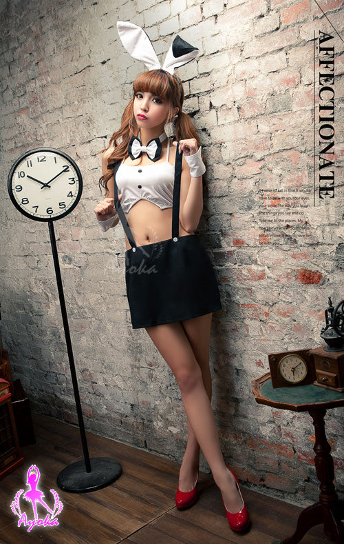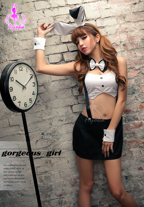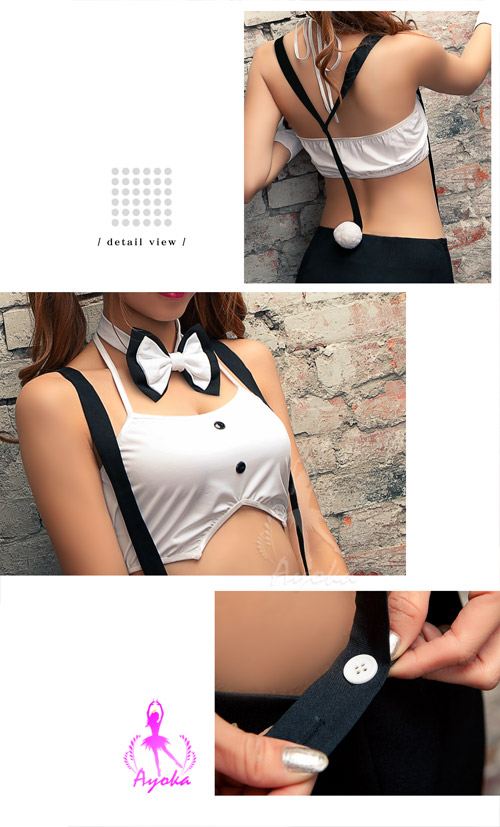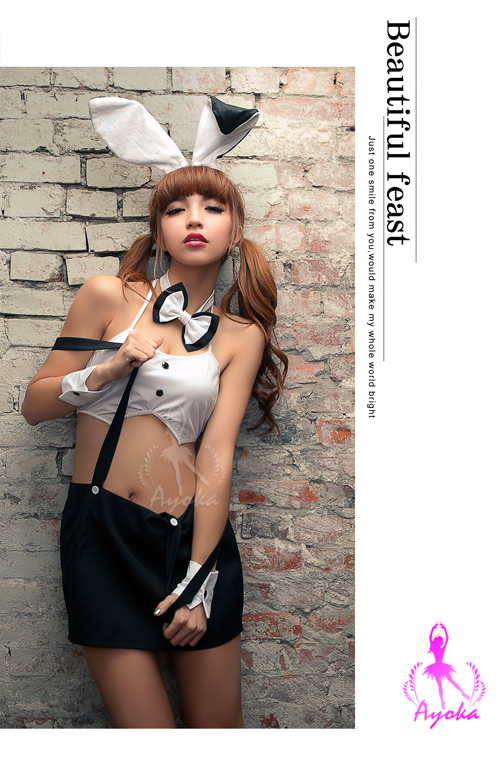 。規格尺寸: ◆ 內容物:綁頸短上衣x1+Y字背帶短裙x1+兔耳髮箍x1+領圈x1+手腕套x2