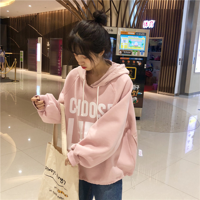 2018新款秋冬韓版慵懶風加絨加厚字母撞色口袋連帽衛衣上衣外套女