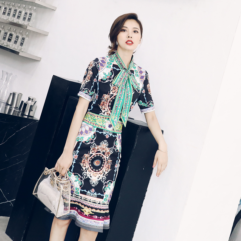 / 名媛歐洲站女神范裙子收腰顯瘦印花短袖蝴蝶結上衣半身魚尾裙套裝