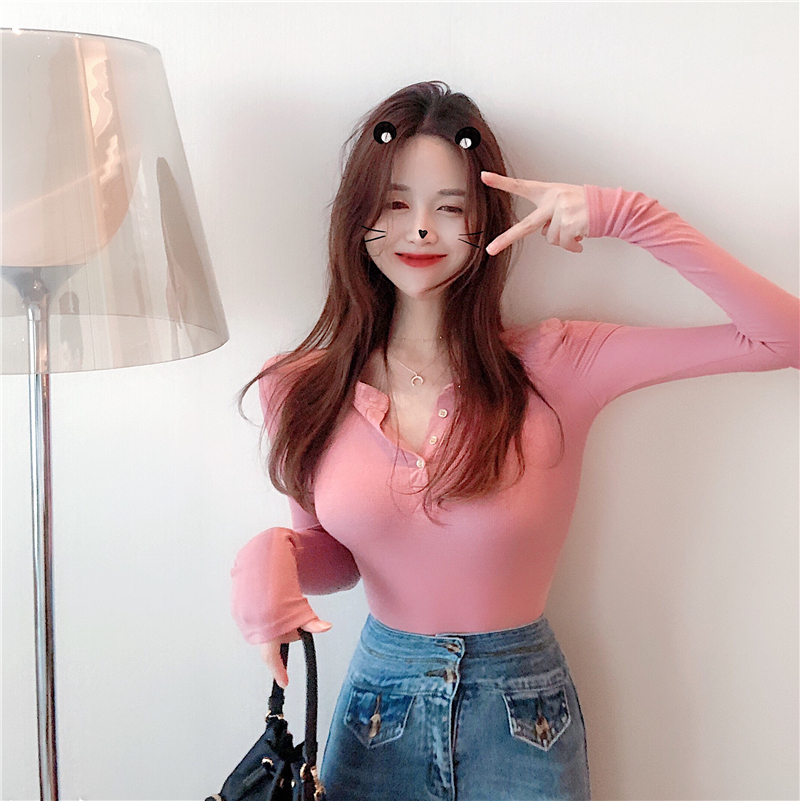 / 秋裝女2018新款時尚韓風修身顯瘦百搭紐扣長袖T恤純色打底衫上衣