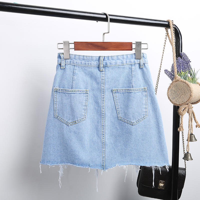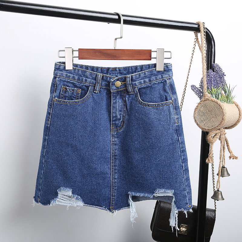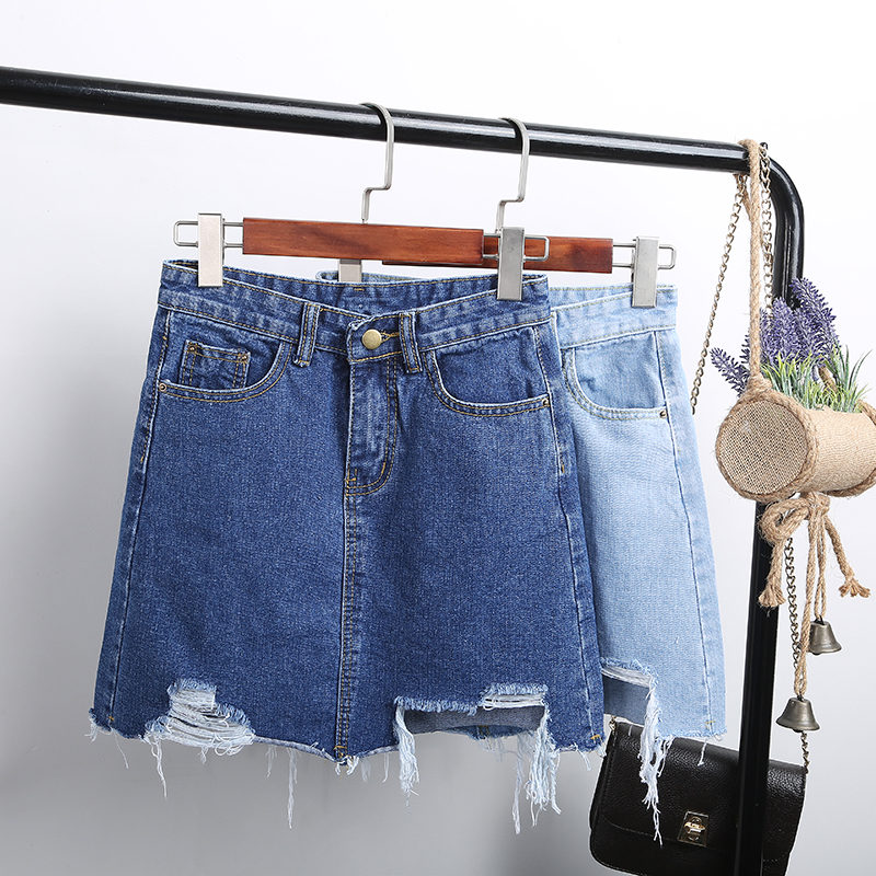 夏季韓版高腰牛仔裙半身裙女破洞短裙A字裙包臀半裙磨破裙子