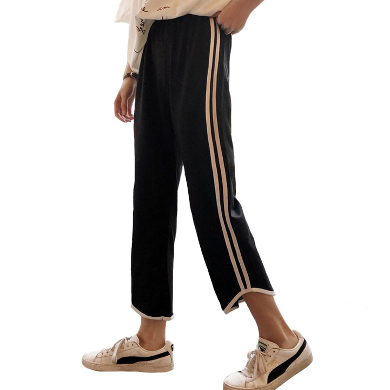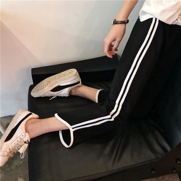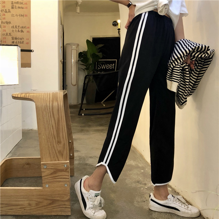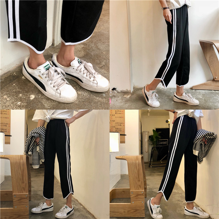 / 秋裝女裝韓版寬松側條紋九分褲闊腿褲休閑學生高腰顯瘦直筒褲長褲