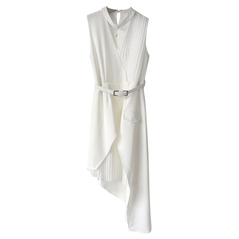 S秀名媛氣質2018夏季新款純色拼接無袖連衣裙女時尚褶皺不規則裙