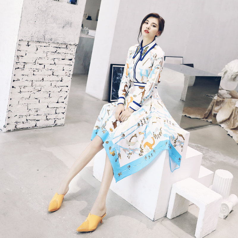 / 2018秋季新款印花收腰高端名媛氣質長袖襯衫上衣不規則半身裙套裝