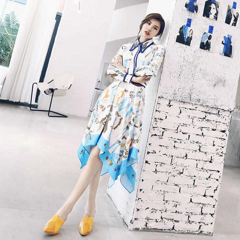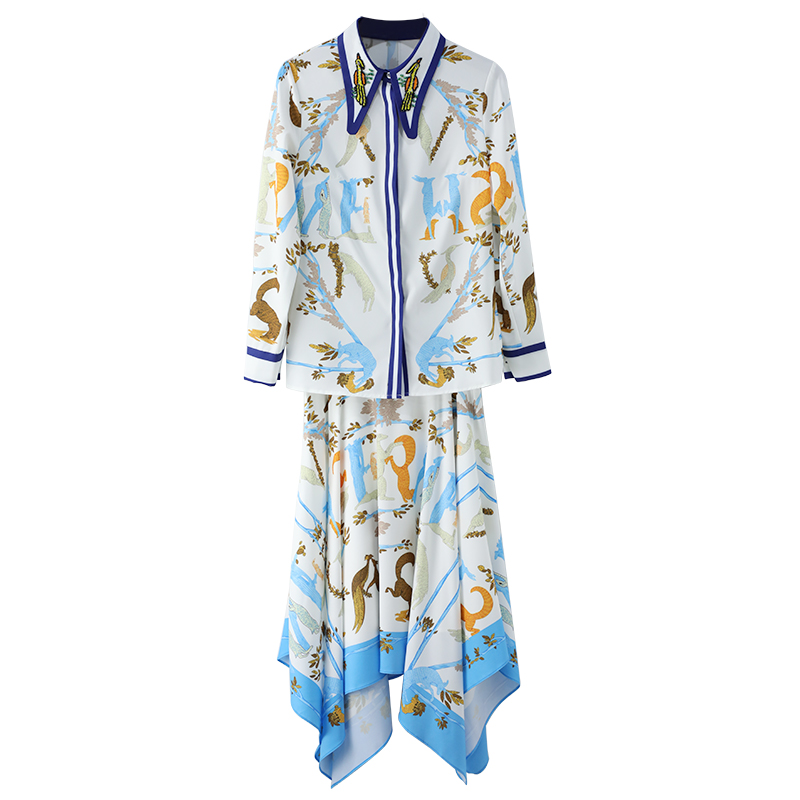 2018秋季新款印花收腰高端名媛氣質長袖襯衫上衣不規則半身裙套裝