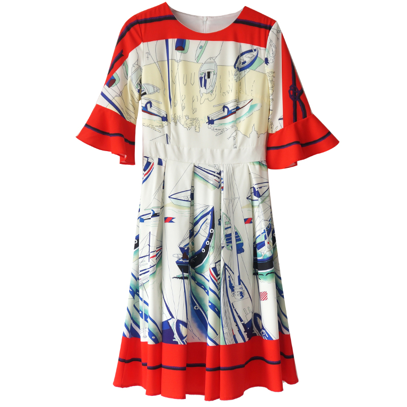 / 裙子名媛氣質夏女2018新款五分袖中長款大擺顯瘦復古印花連衣裙潮