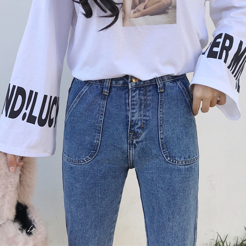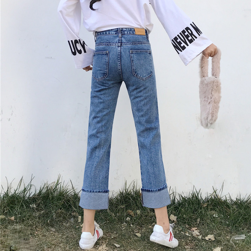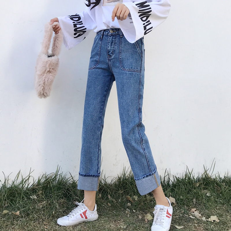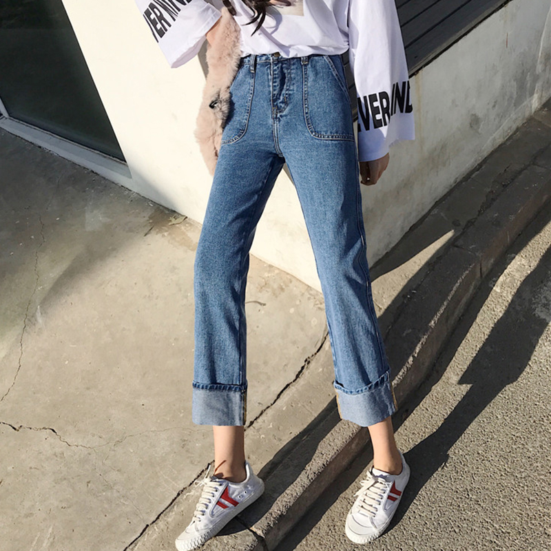 高腰牛仔褲女學生秋裝寬松直筒褲子新款韓版顯瘦翻邊九分闊腿褲潮