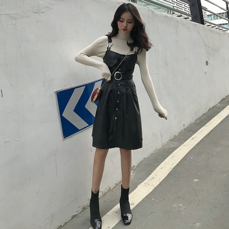 / 港風時尚秋冬新款韓版套裝背帶連衣皮裙長袖修身打底針織衫兩件套