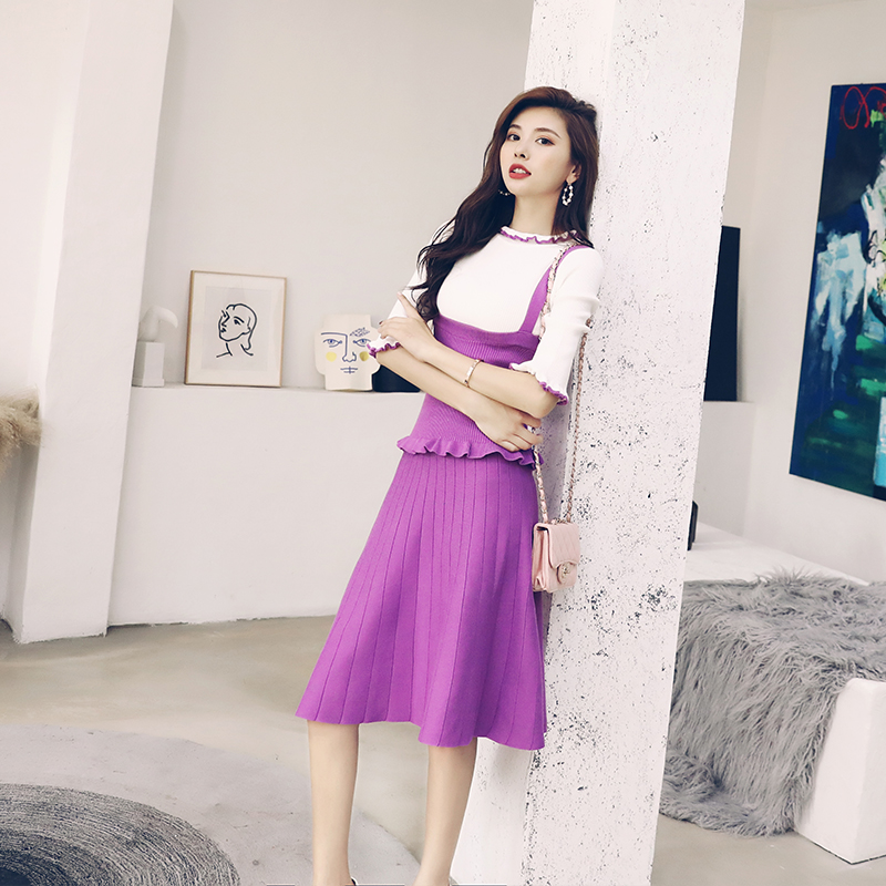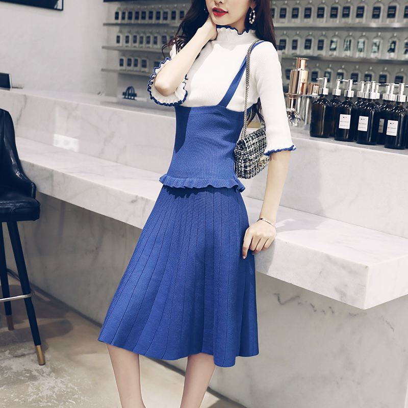 歐洲站2018秋季新款修身半袖針織上衣打底衫吊帶連衣裙兩件套套裝