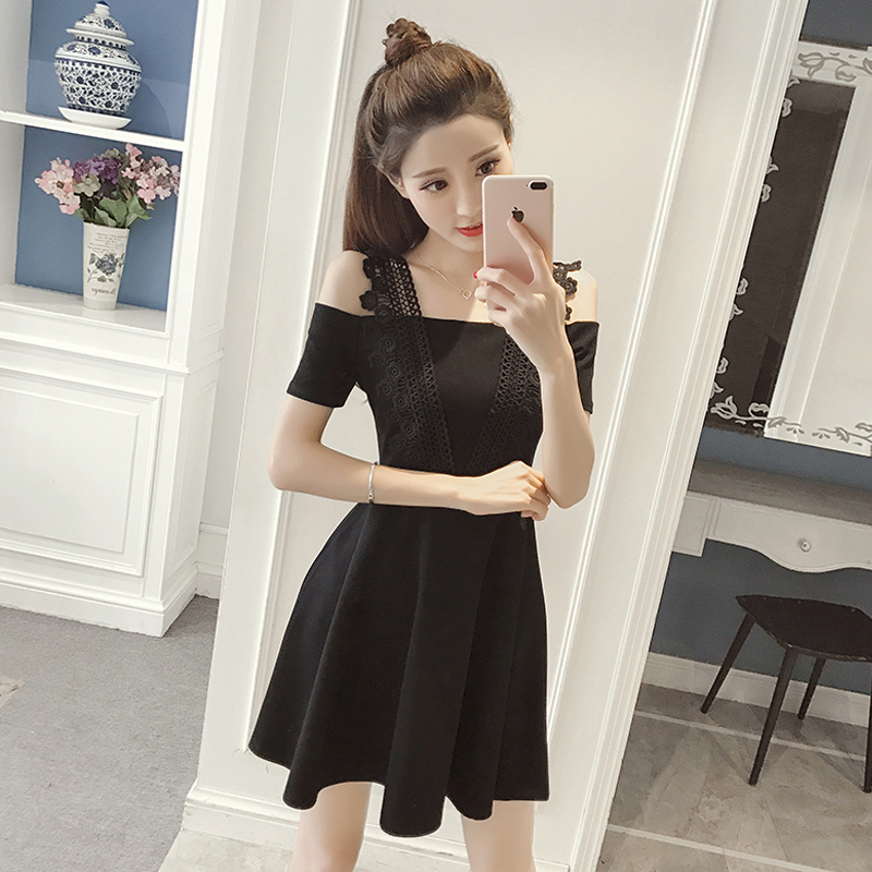 2017夏季韓版女裝新款氣質修身顯瘦短袖蕾絲花邊拼接A字連衣裙子