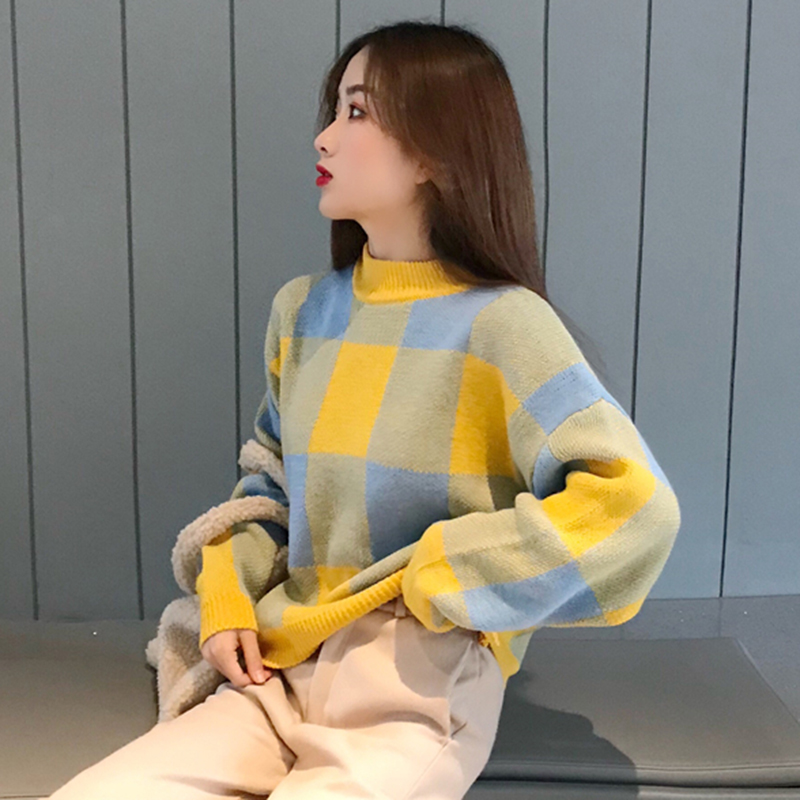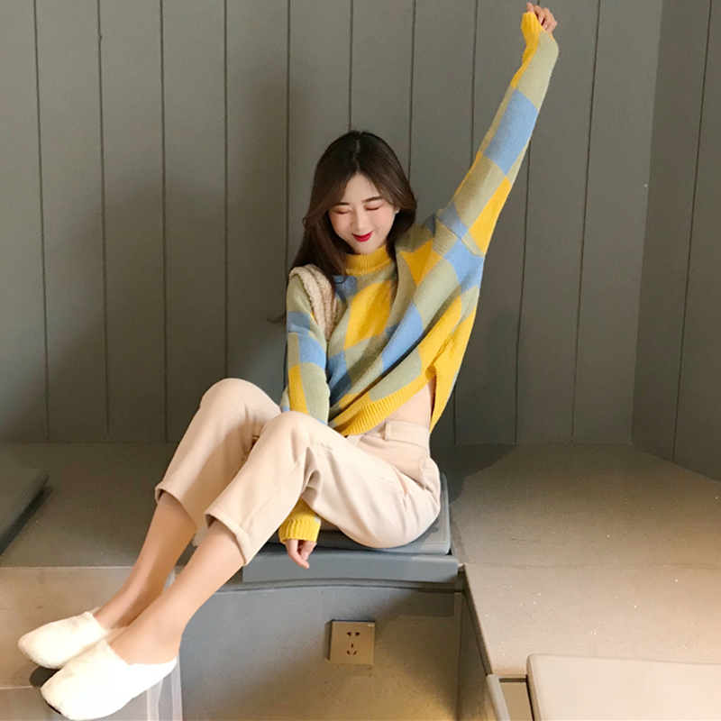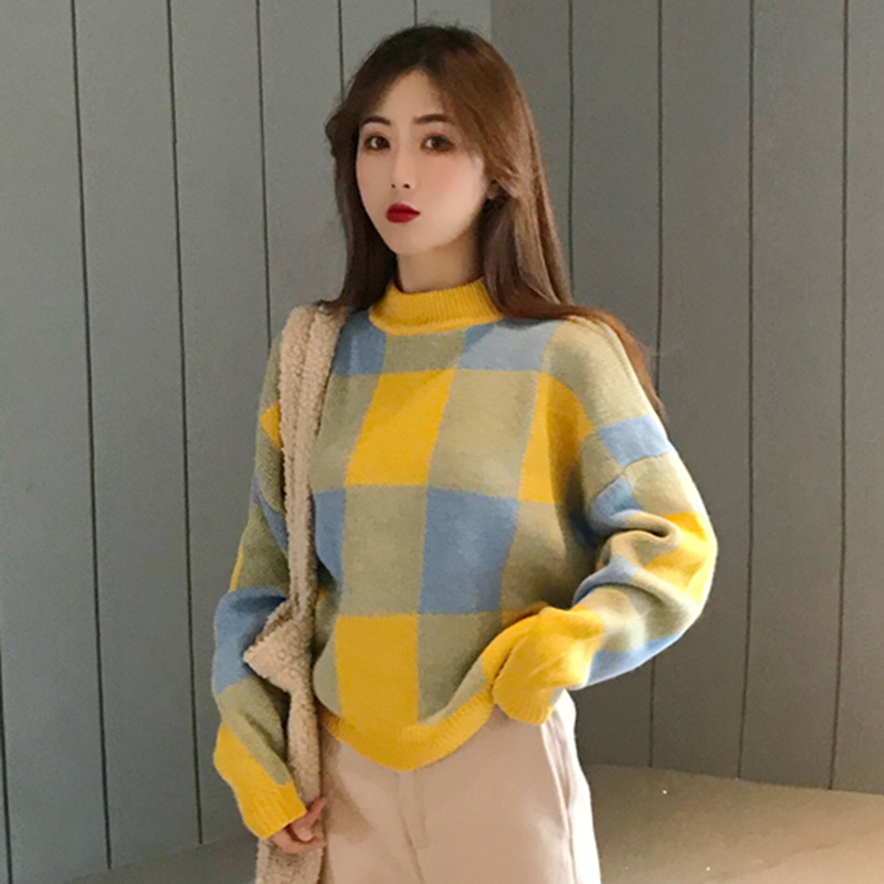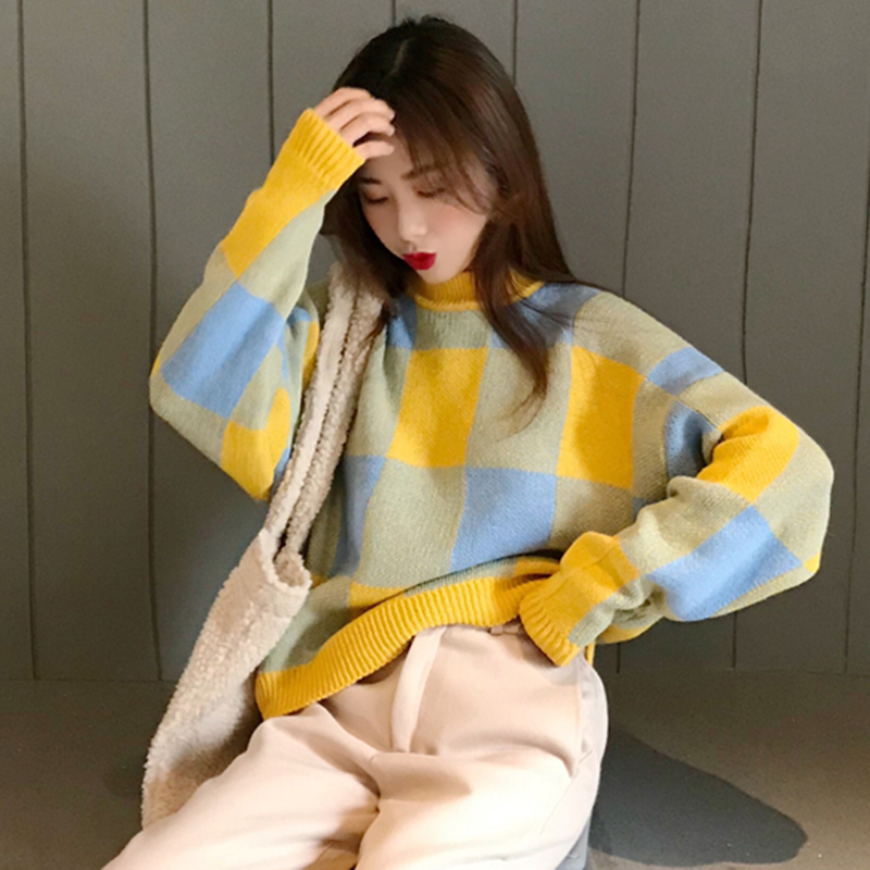 寬松慵懶毛衣女秋冬裝2018新款時尚格子針織外套學生圓領長袖上衣