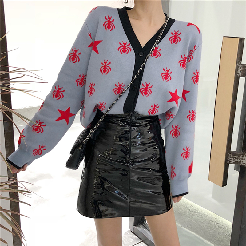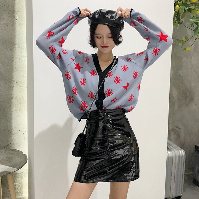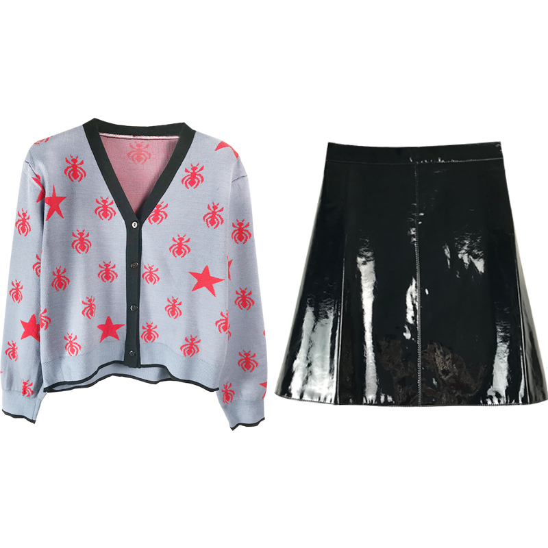 / 兩件套秋裝女2018新款星星提花V領寬松長袖針織開衫亮皮A字短裙子