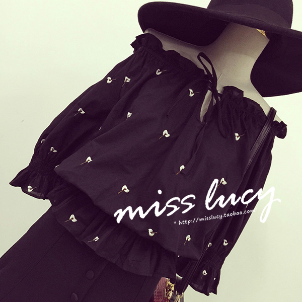/ 夏裝新款韓國寬松刺繡木耳邊系帶一字肩套頭短款雪紡衫上衣女