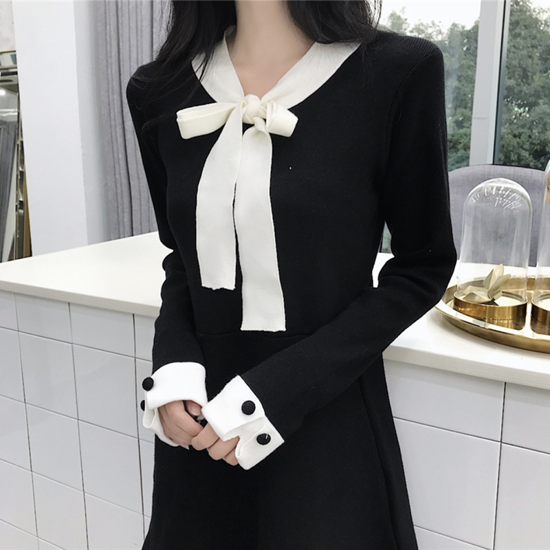 / 港味chic綁帶蝴蝶結裙子女秋冬裝2018新款氣質顯瘦針織A字連衣裙