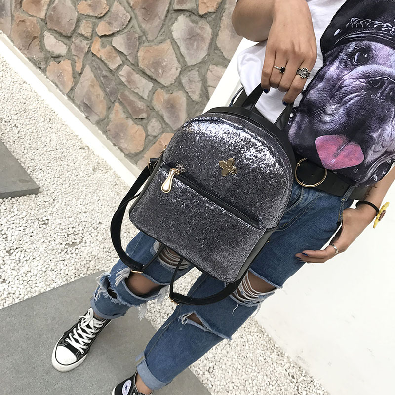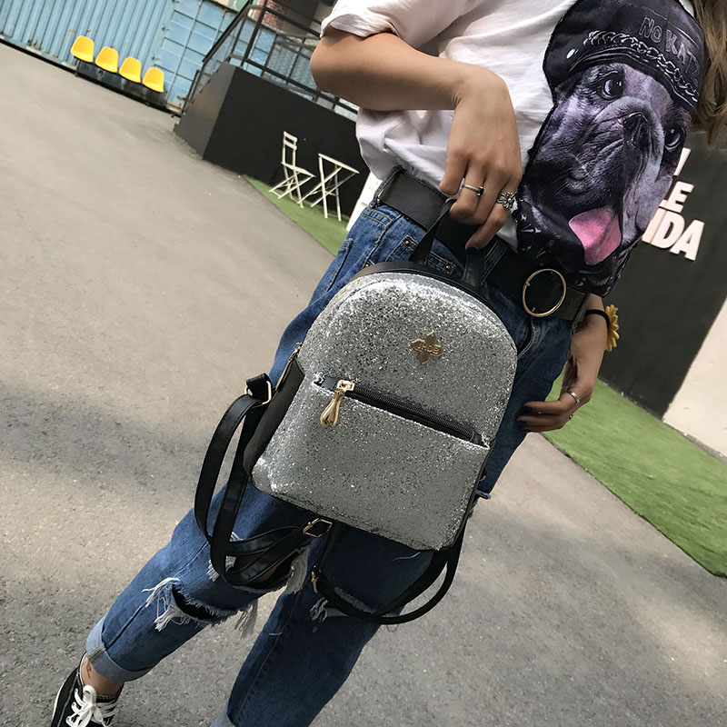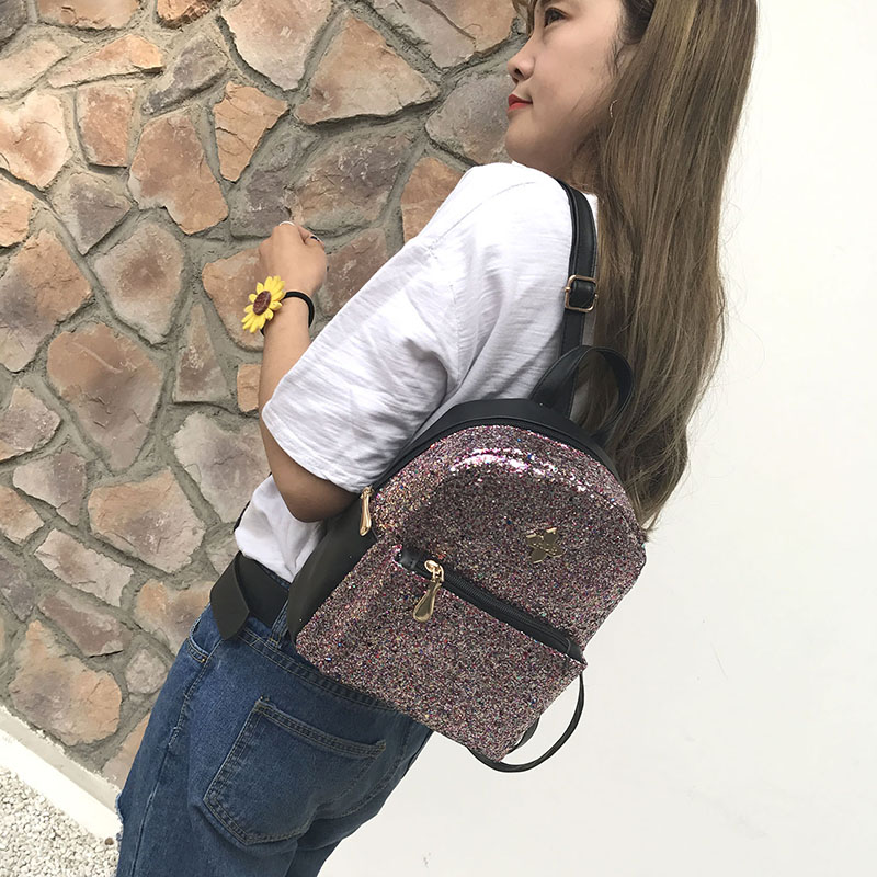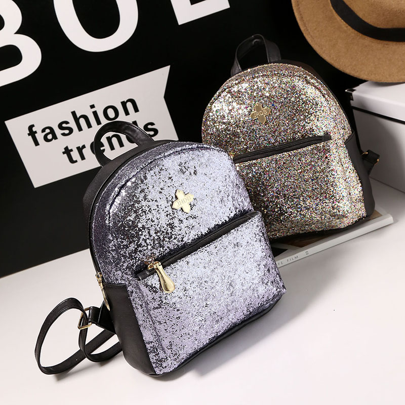 2017春夏新款亮面雙肩包女包韓版時尚潮百搭菱格背包亮片軟皮書包