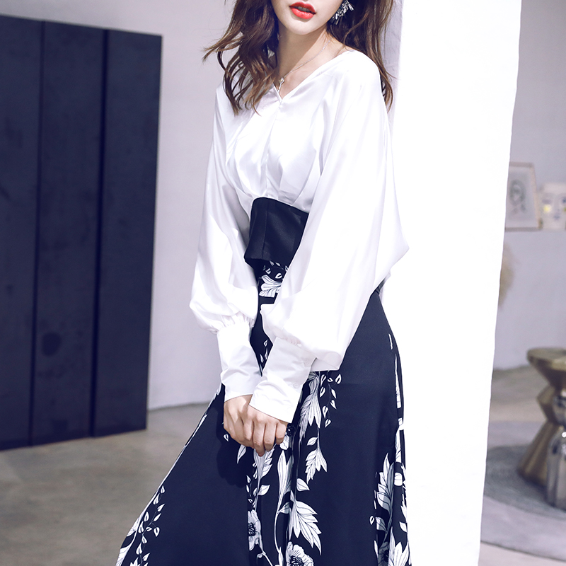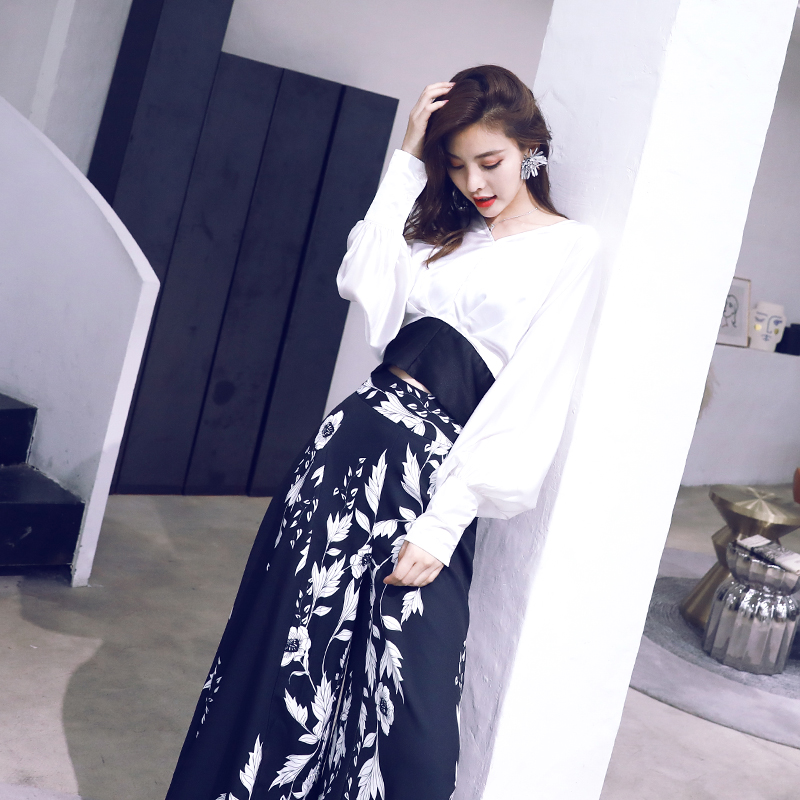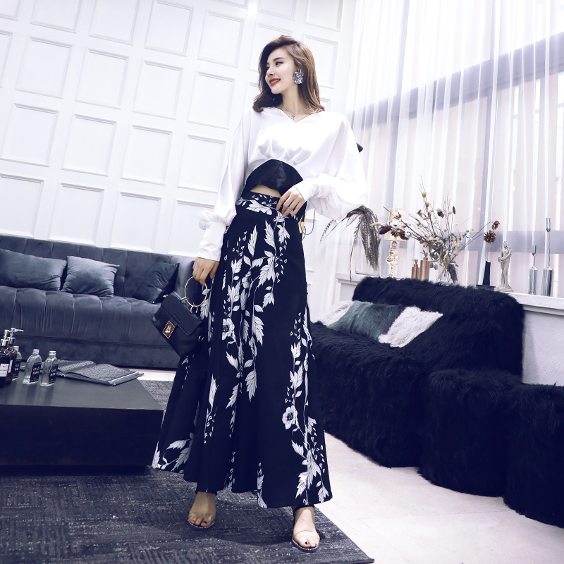 / 高腰闊腿褲套裝女2018夏季新款時尚洋氣長袖襯衣印花顯瘦兩件套潮