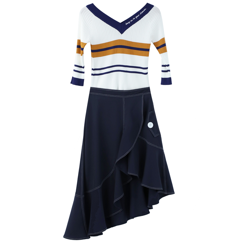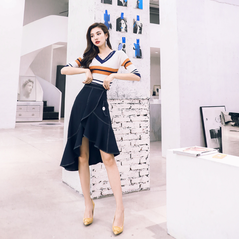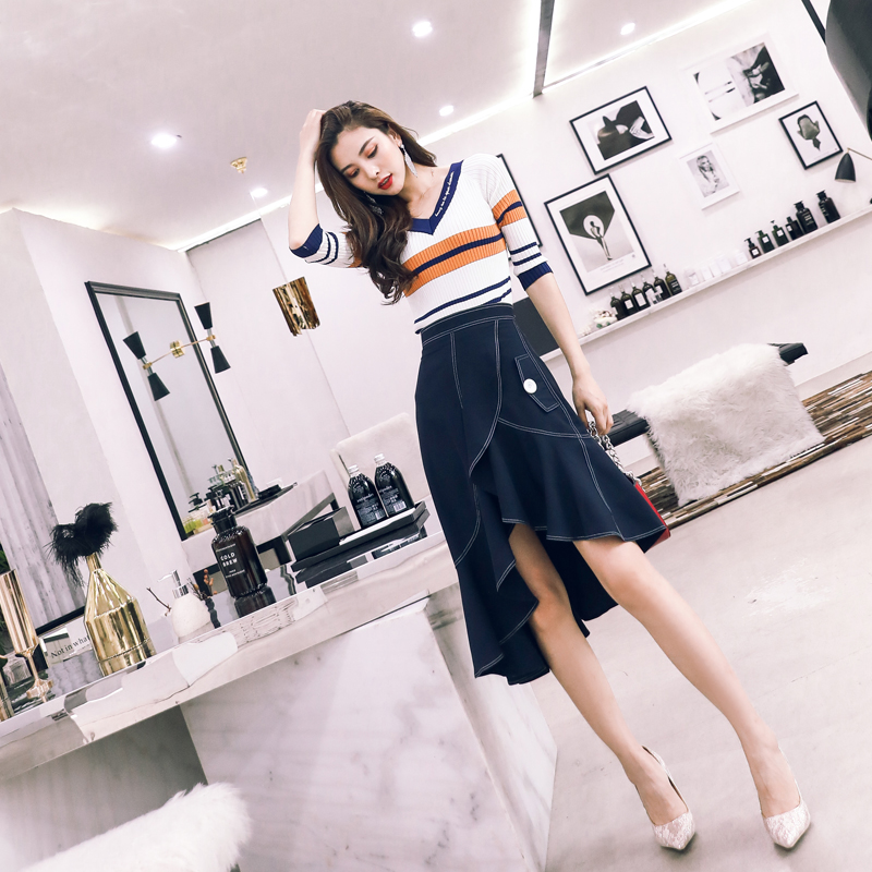 2018初秋新款時尚女神套裝針織衫上衣荷葉邊不規則半身裙兩件套潮