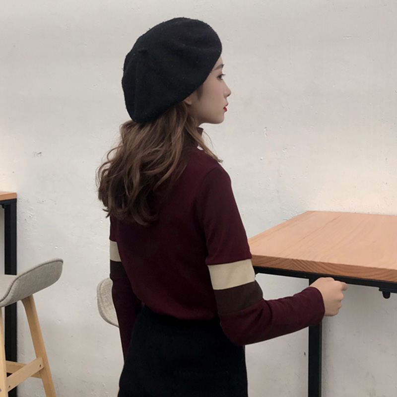 時尚拼色長袖上衣秋裝女2018新款港味修身高領T恤休閑加絨打底衫