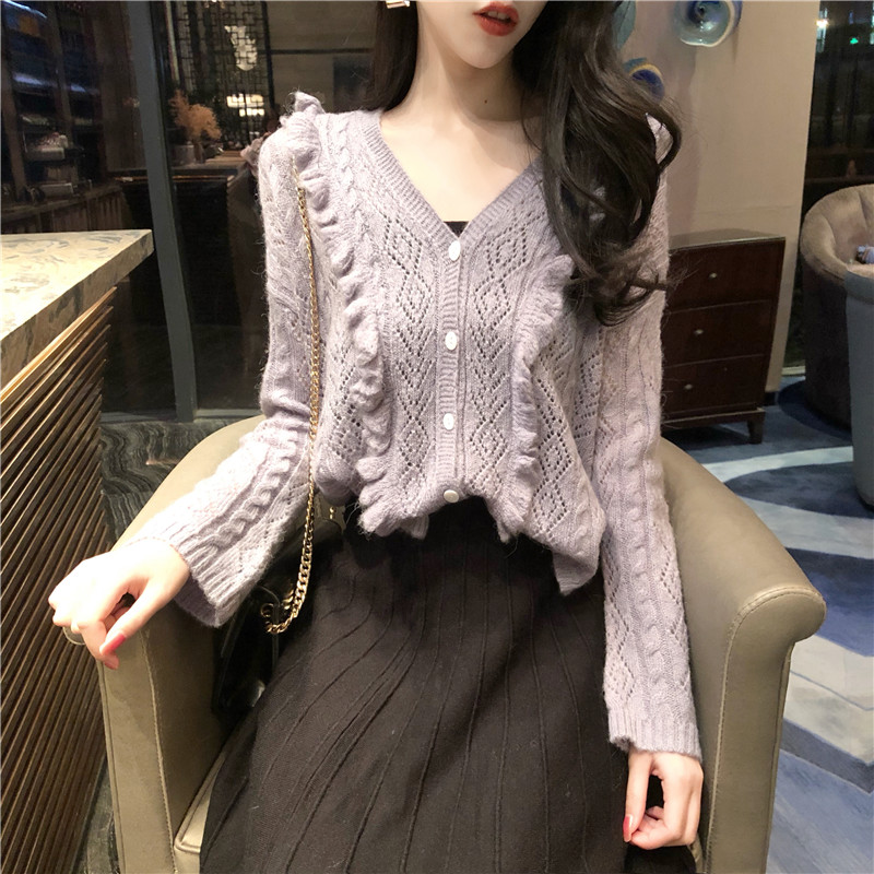 韓國新款復古風木耳邊毛衣開衫外套高腰針織半身裙時尚套裝兩件套