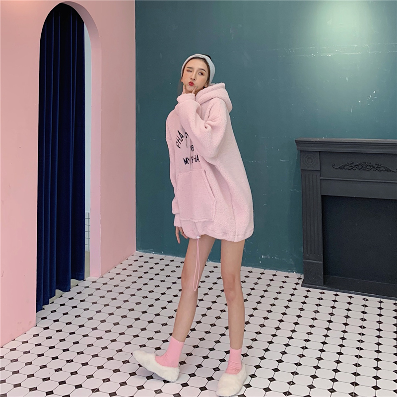 / 韓版慵懶風上衣女寬松連帽刺繡字母羊羔毛套頭中長款衛衣外套女潮