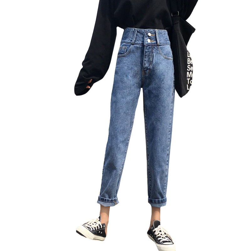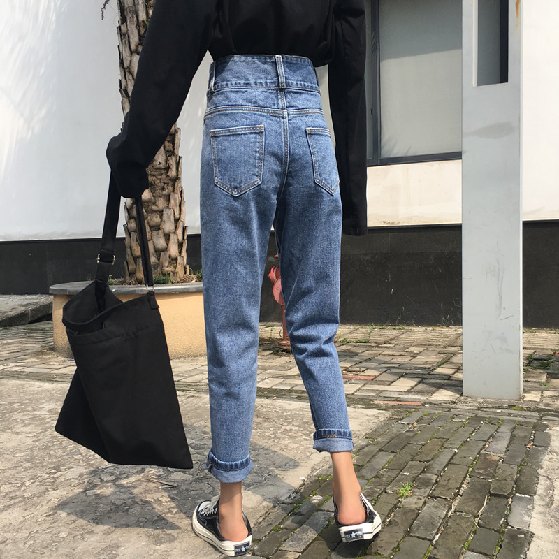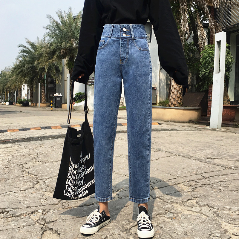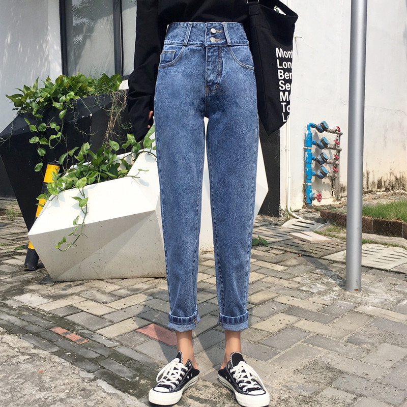 / 秋季韓版chic高腰兩顆扣牛仔褲寬松顯瘦簡約直筒褲長褲學生褲子女