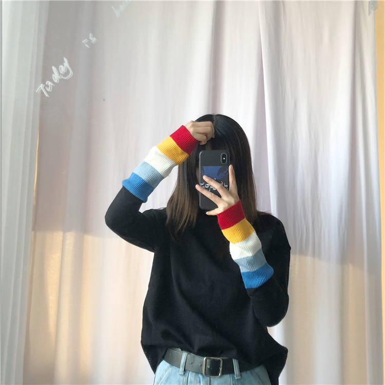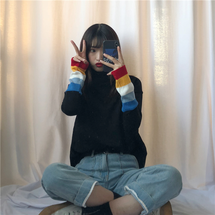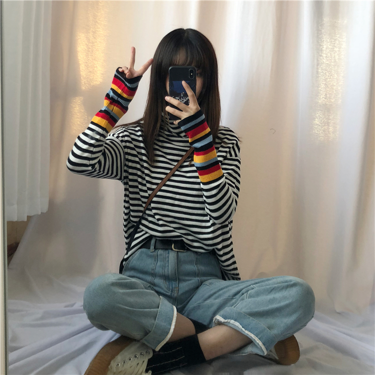 / 2018新款秋冬韓版高領彩條袖子打底網紅套頭針織衫毛衣上衣外套女