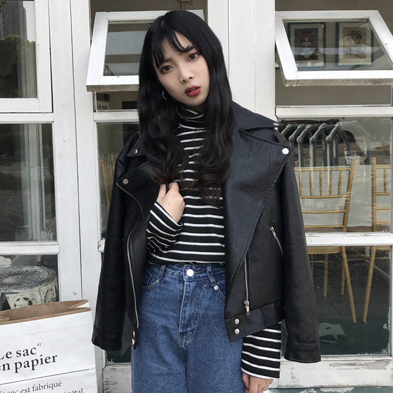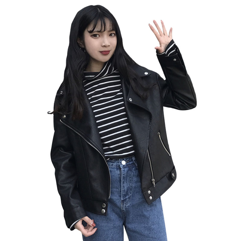 / 秋冬韓版寬松長袖機車服皮衣短款PU皮拉鏈翻領夾克開衫上衣外套女