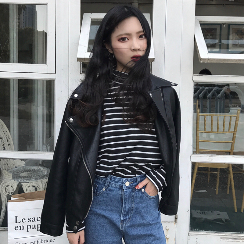 秋冬韓版寬松長袖機車服皮衣短款PU皮拉鏈翻領夾克開衫上衣外套女