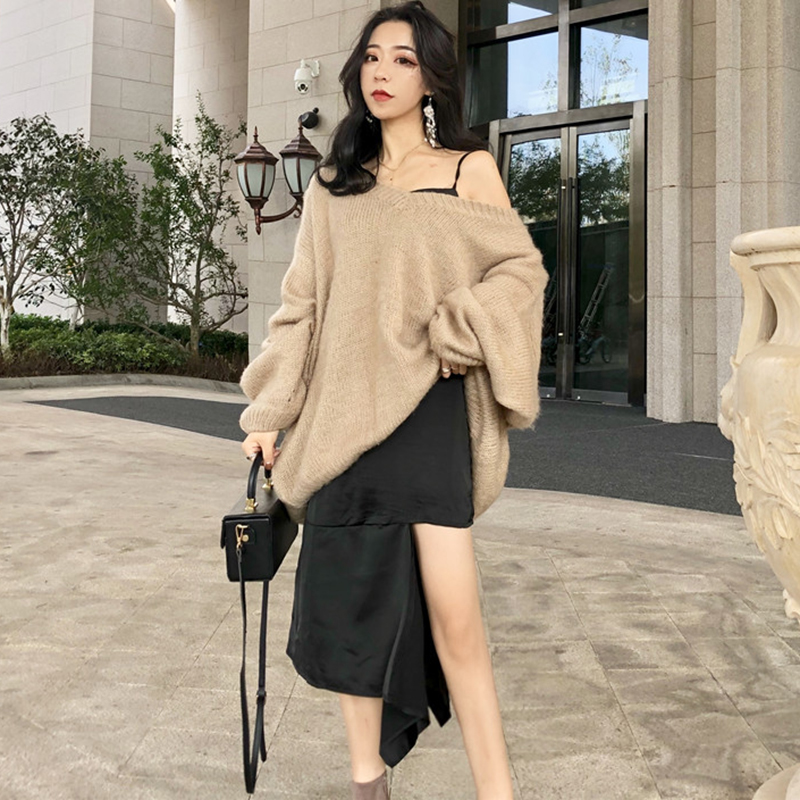 / 御姐套裝女秋冬新款V領寬松慵懶風毛衣針織外套豹紋吊帶連衣裙子