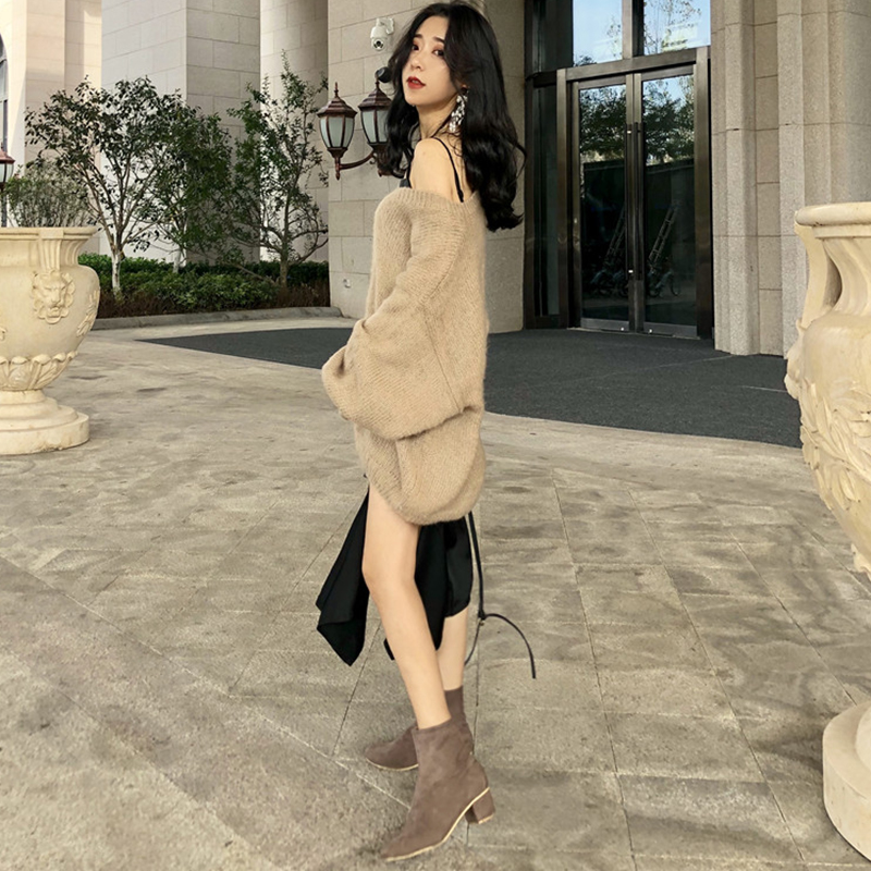 藍色毛衣|奶茶色毛衣|黑色吊帶裙|豹紋吊帶裙