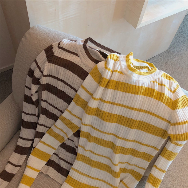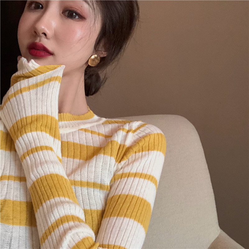 / 打底衫女秋冬季新款修身百搭柔軟條紋撞色長袖圓領保暖針織衫上衣