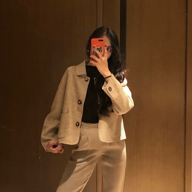 / 2018秋季時尚套裝韓版復古慵懶格紋外套高腰九分褲半身裙三件套女