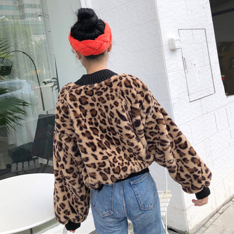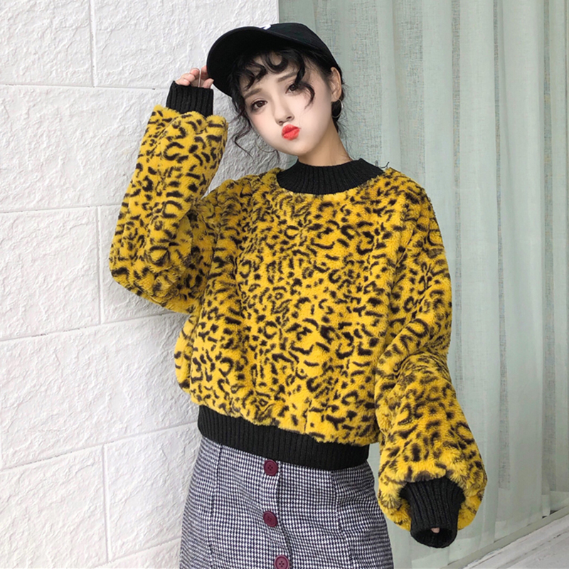 / 復古豹紋毛絨衛衣秋冬女裝新款寬松燈籠長袖外套圓領休閑短款上衣