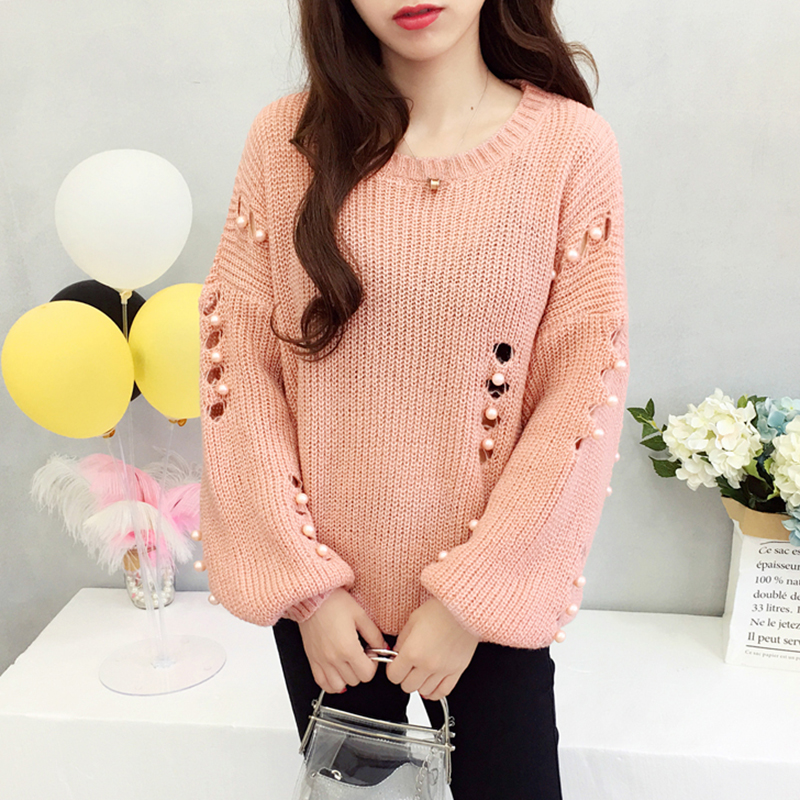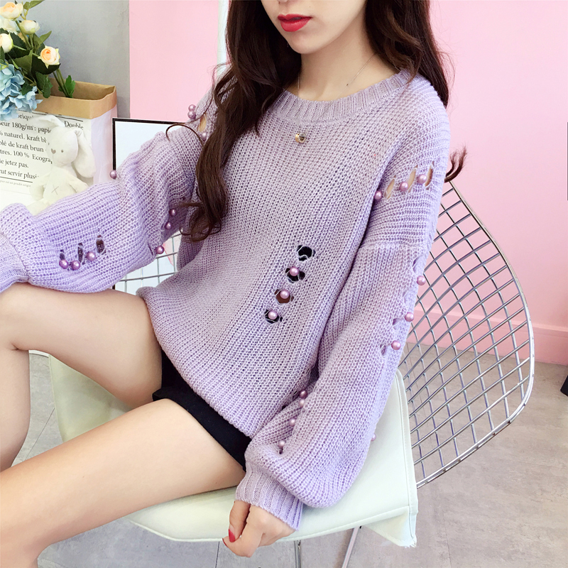 慵懶風鏤空破洞透視針織衫女秋冬裝2018新款韓版寬松釘珠毛衣外套