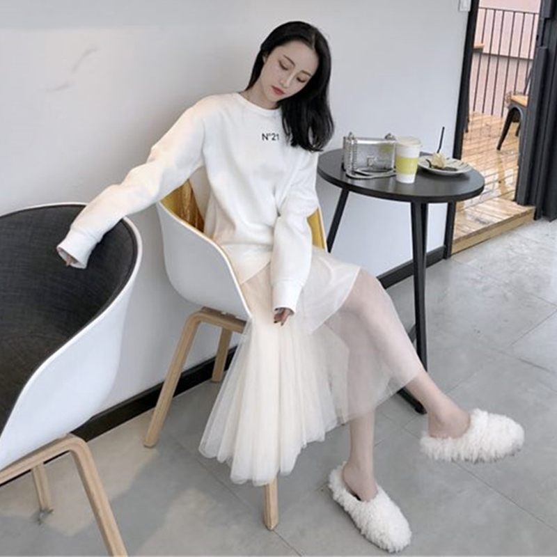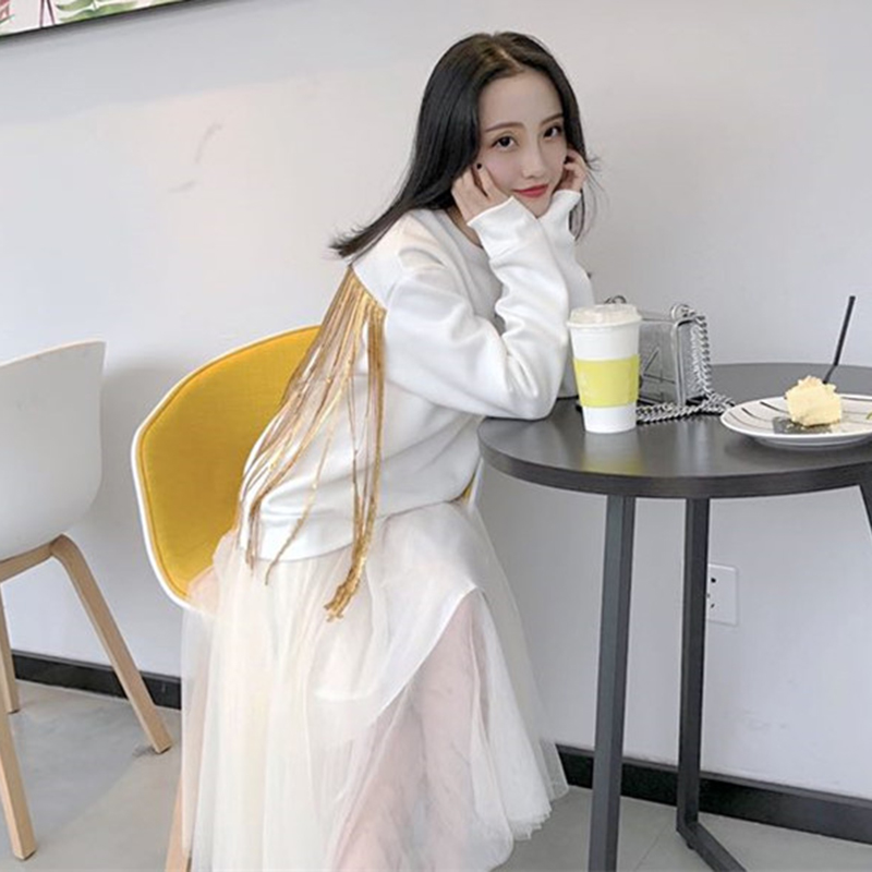 / 氣質女神兩件套冬裝新款后背亮片流蘇衛衣時尚高腰A字網紗半身裙