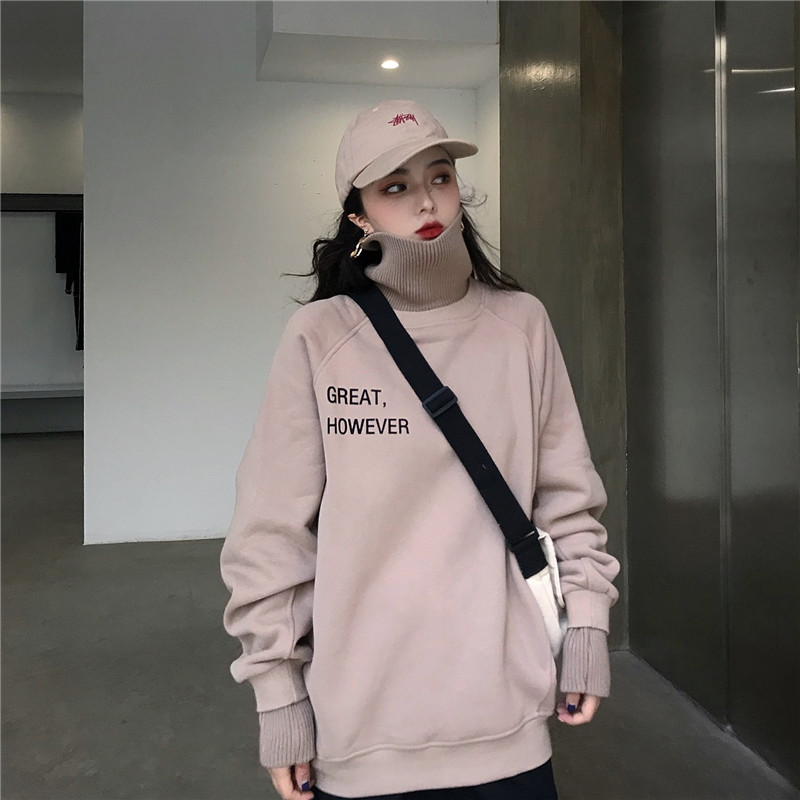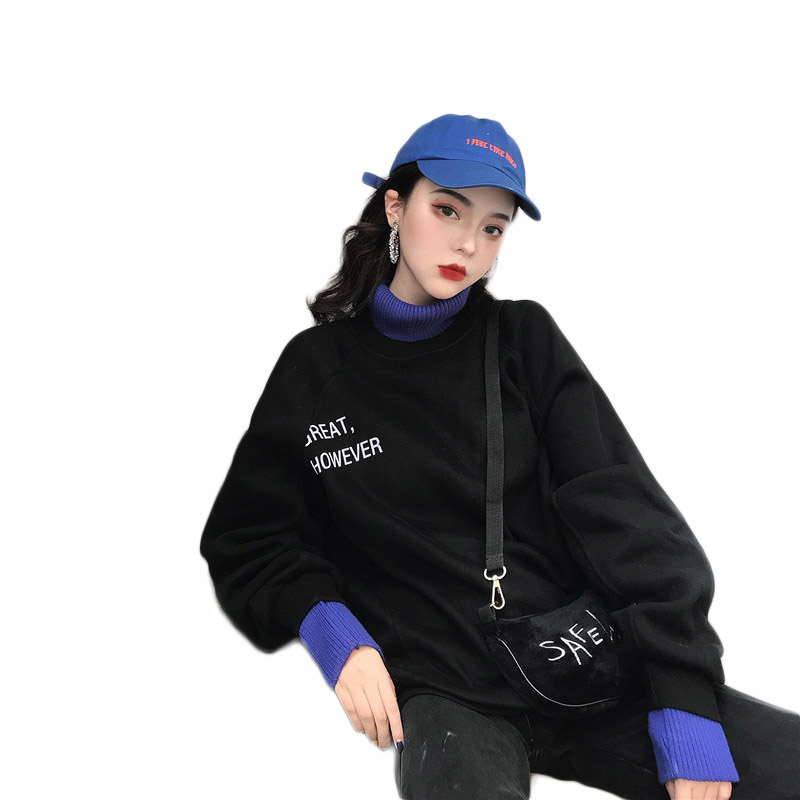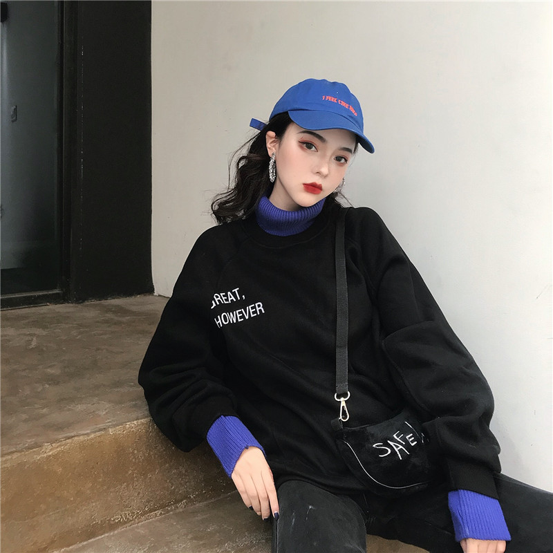 港風寬松加絨套頭衛衣女秋2018新款字母針織高領撞色假兩件外套潮