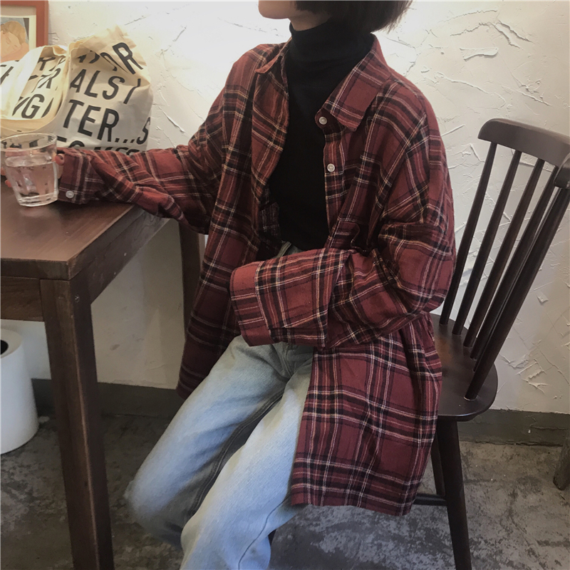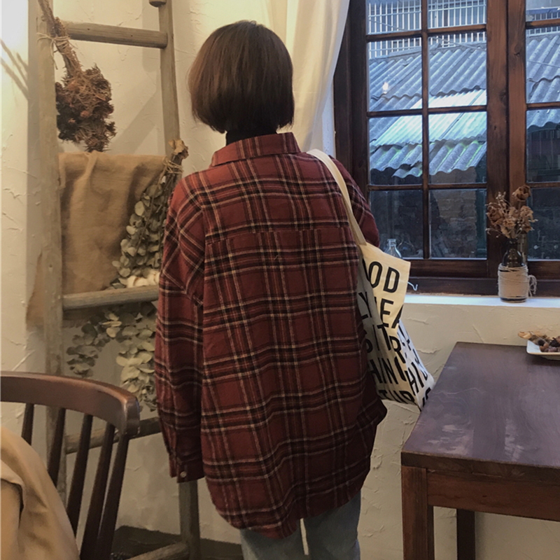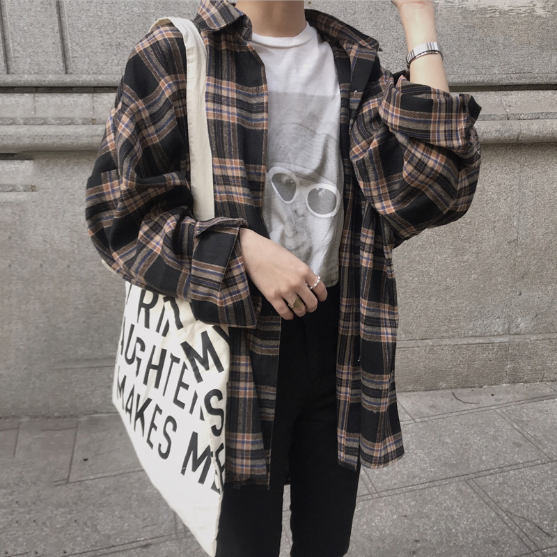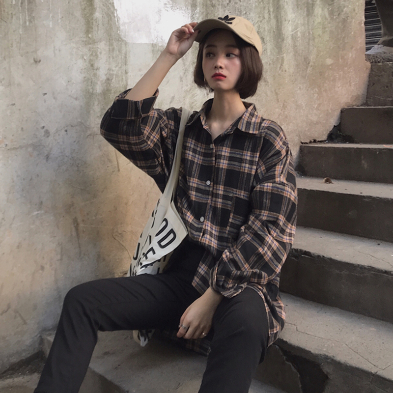 / 港風chic襯衫女秋冬裝2018新款學生寬松中長款復古格子襯衣外套潮