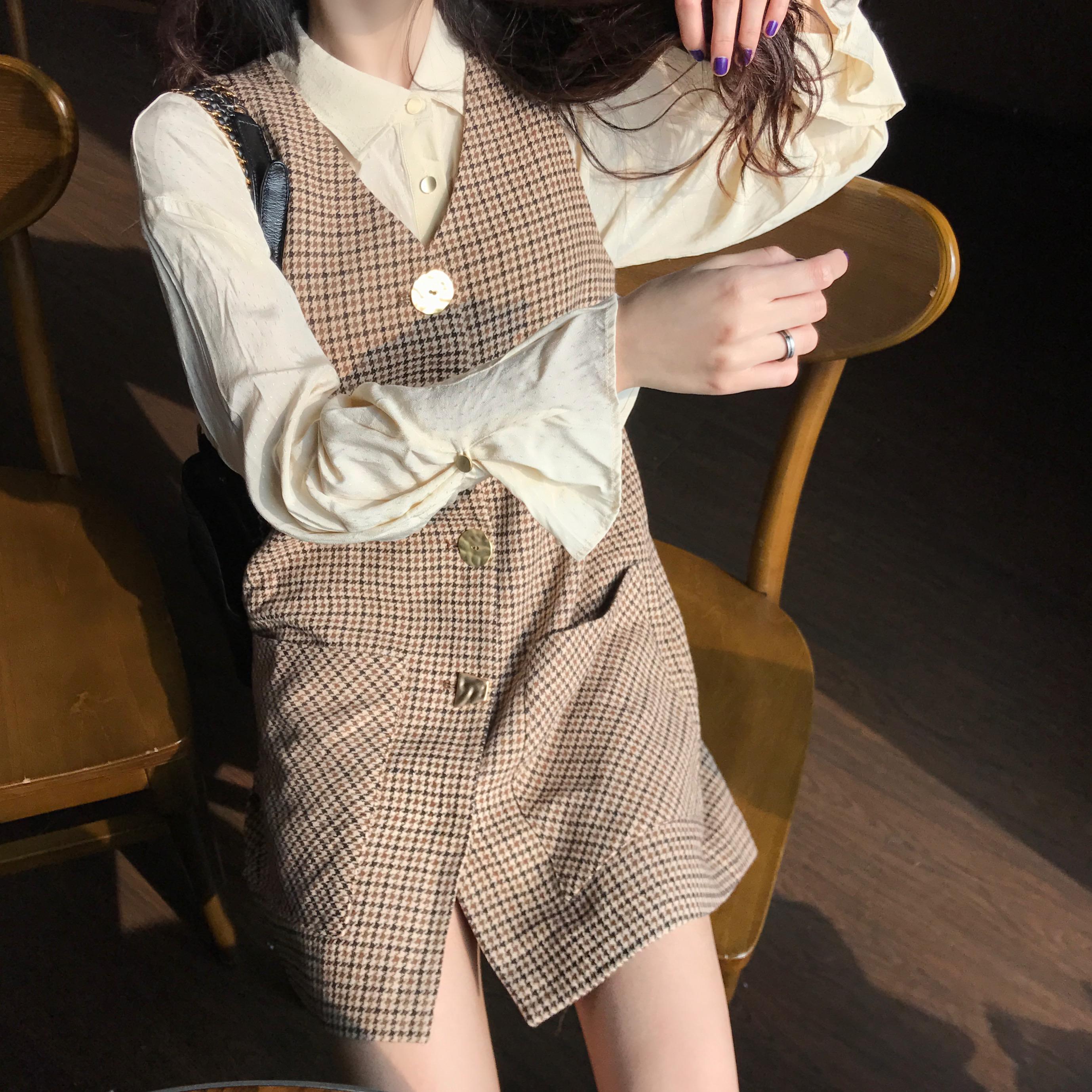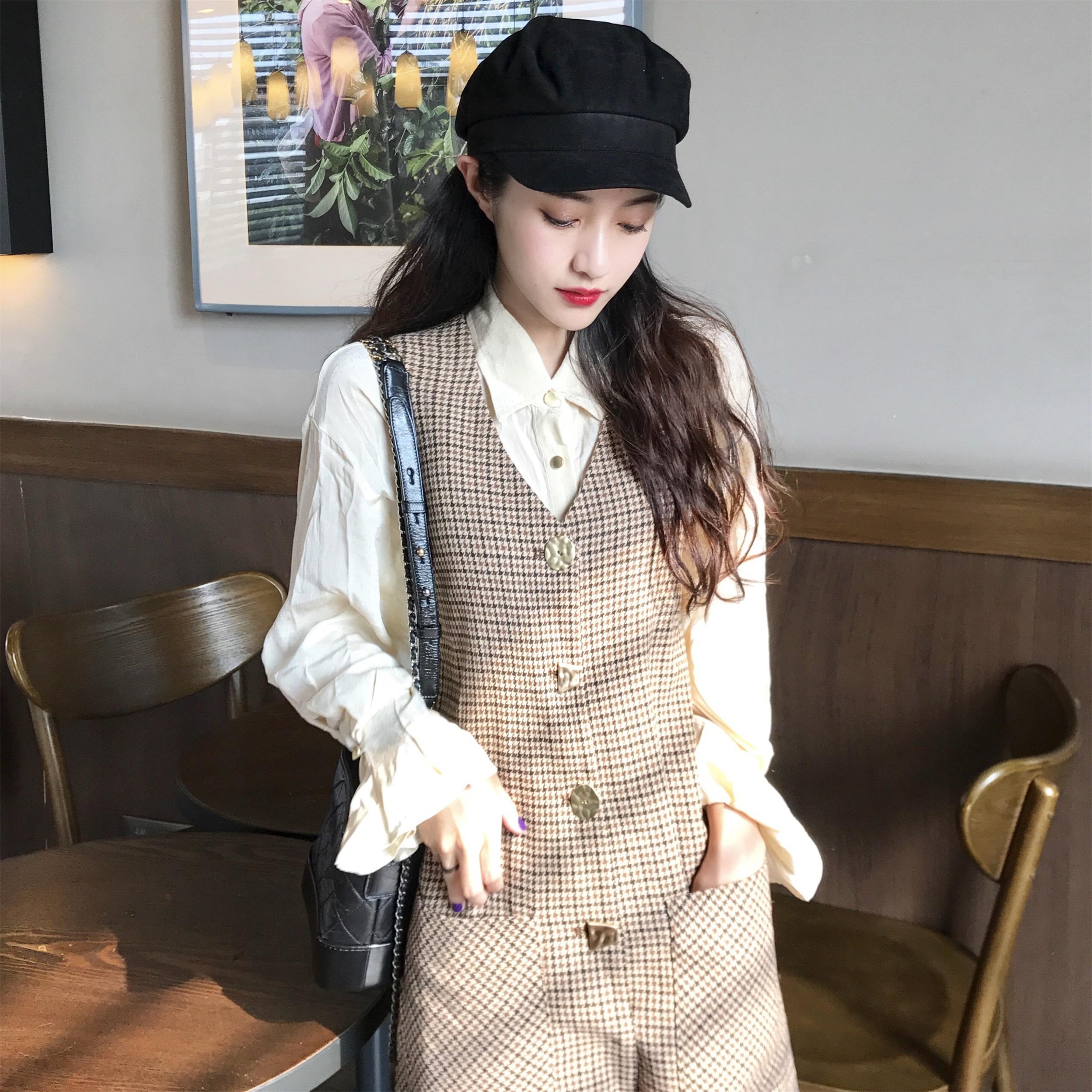 2018秋冬新款韓版時尚套裝網紅休閑襯衫千鳥格背心裙氣質兩件套女