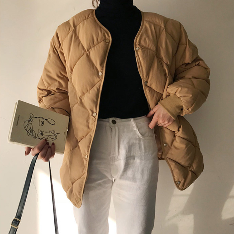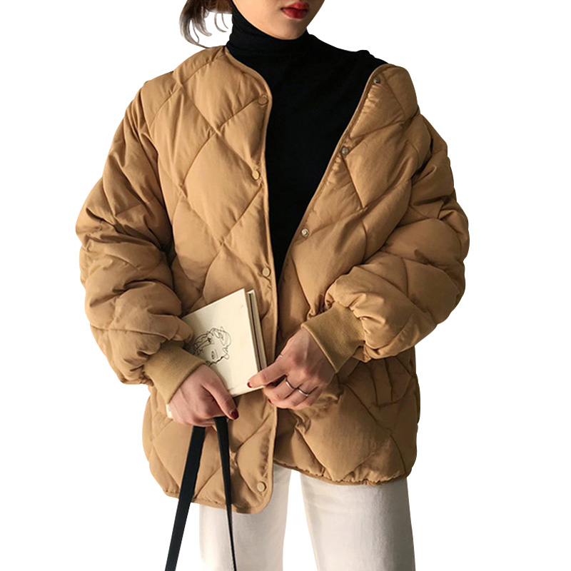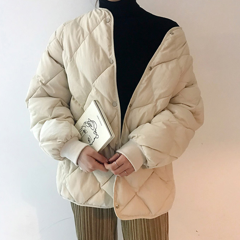 / 保暖冬季新款韓版時尚純色面包服菱形格子加厚純色立領棉衣外套女