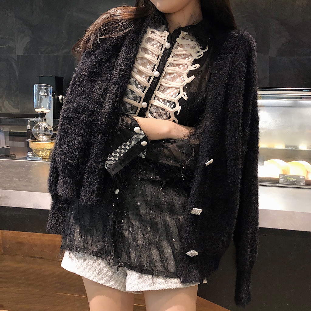 氣質修身襯衫韓版毛毛長袖百搭襯衣+網紅同款毛衣女外套開衫套裝