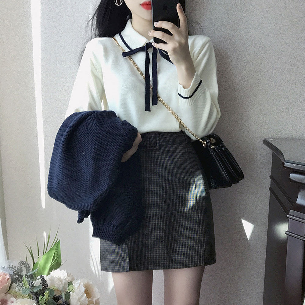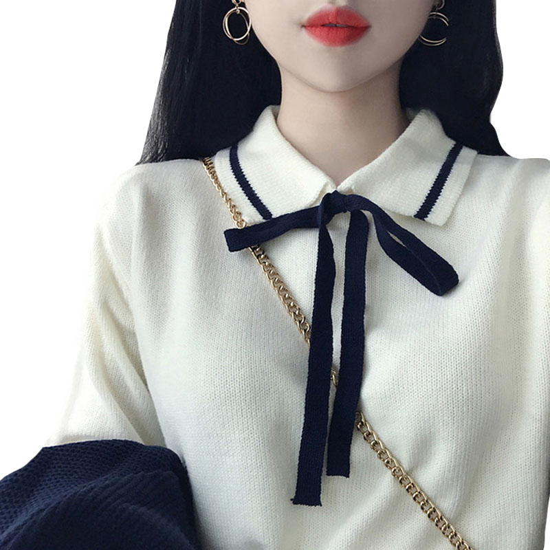 / 秋季女裝韓版寬松小清新系帶蝴蝶結毛衣翻領套頭長袖針織衫上衣潮