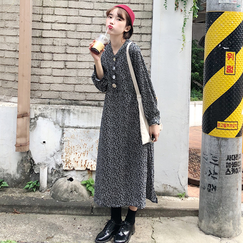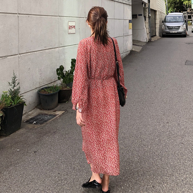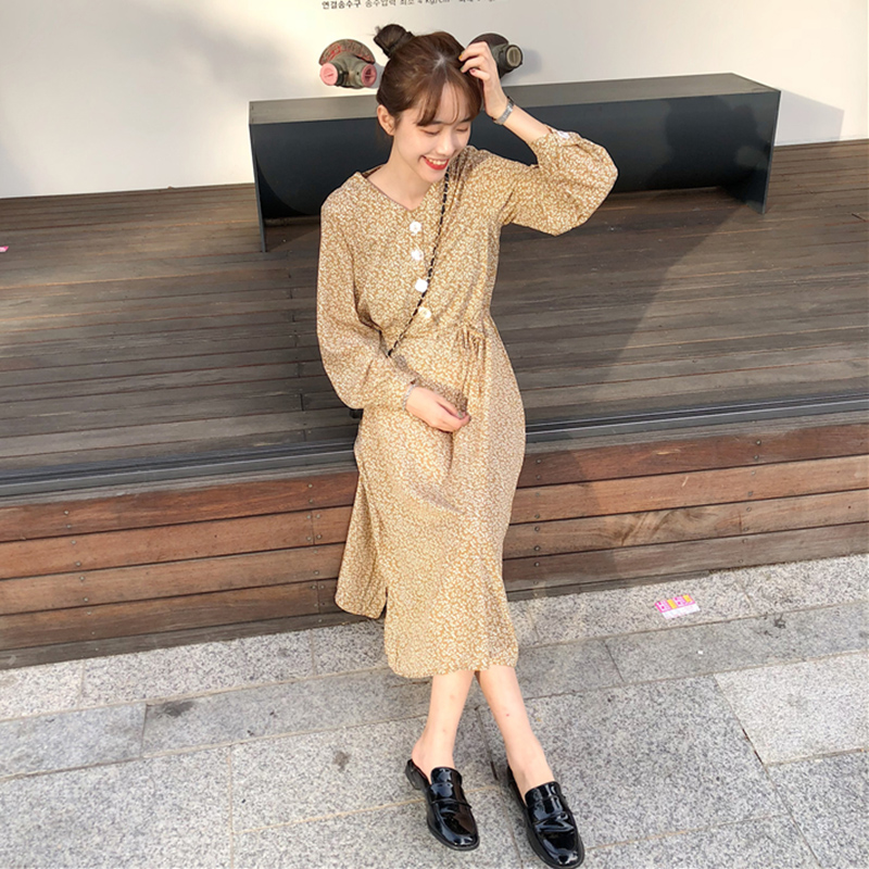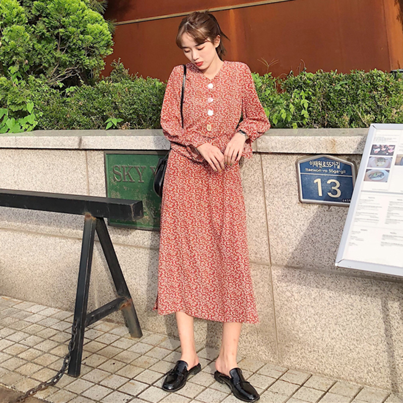 V領碎花裙秋裝女2018新款燈籠長袖開叉中長裙高腰顯瘦A字連衣裙子