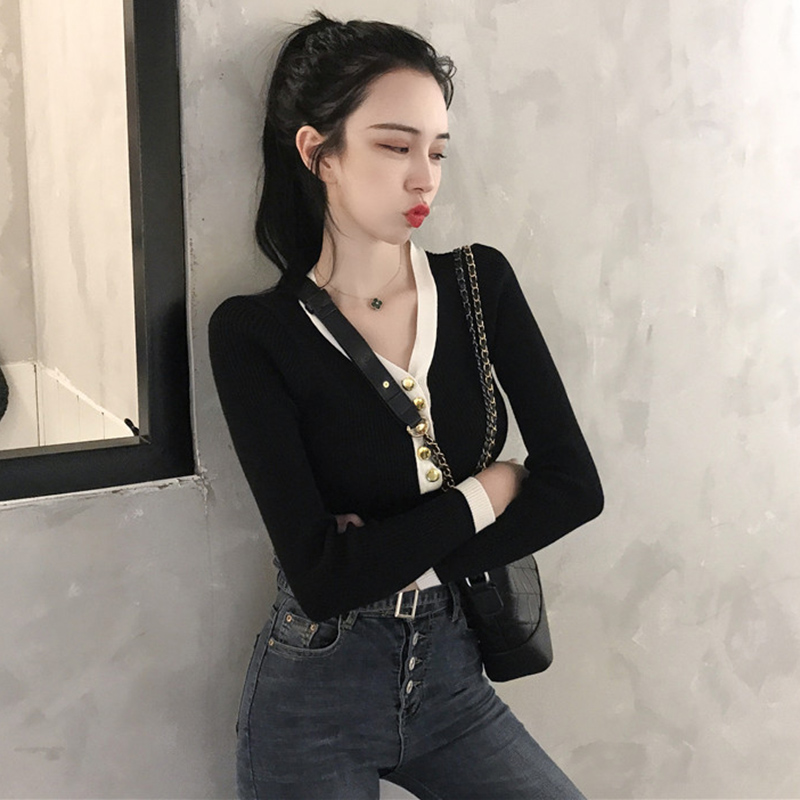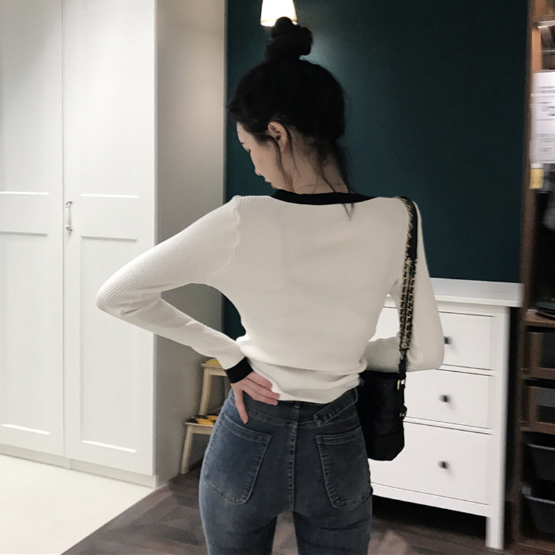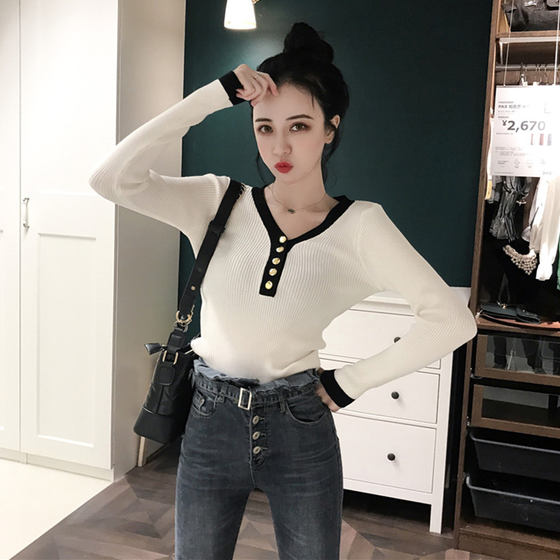 韓風氣質拼色V領修身顯瘦長袖針織衫秋裝女2018新款學生打底上衣
