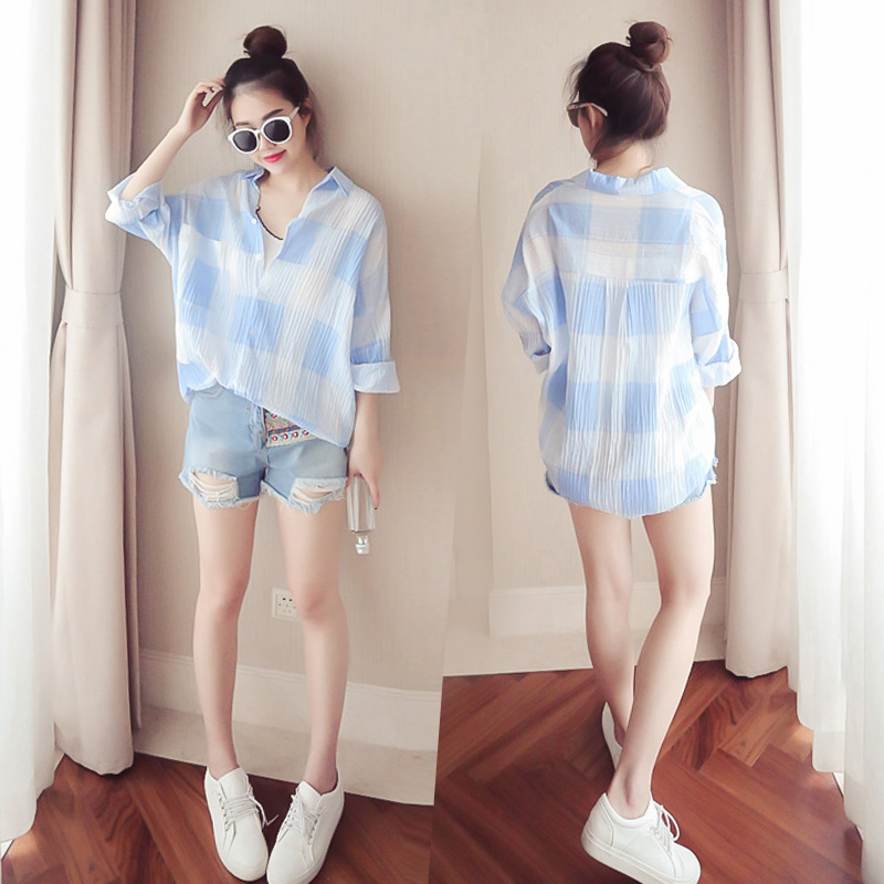 2017夏季新款格子百搭女裝韓版寬松中長款雪紡防曬衣薄款外套開衫