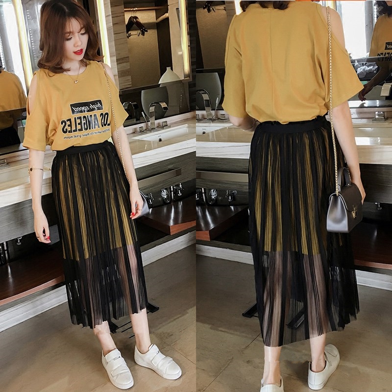 / 夏季新款韓版寬松大碼短袖t恤連衣裙女網紗半身裙兩件套裝裙