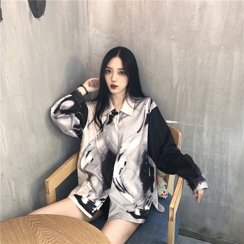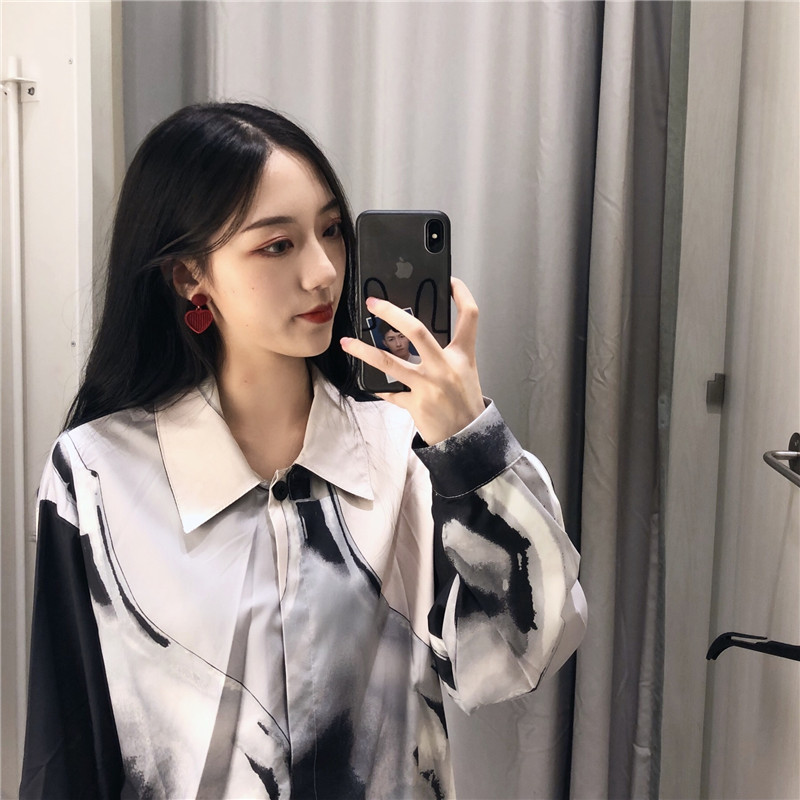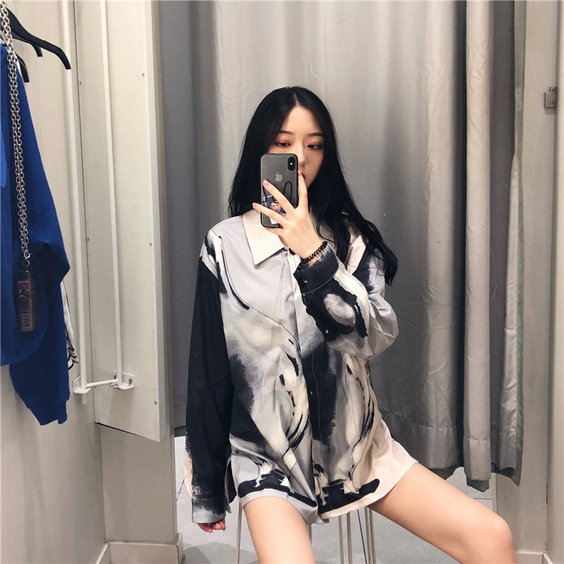 / 時尚女裝秋冬新款原宿BF風寬松涂鴉百搭襯衫中長款長袖開衫上衣潮